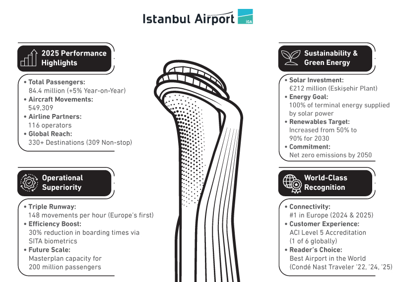 Innovation and Operational Excellence: As the first airport in Europe to implement Triple Runway Operations, iGA has increased its capacity to 148 aircraft movements per hour. This efficiency is mirrored in its digital-first strategy: utilizing AI chatbots, RFID baggage tracking, and biometric boarding systems that have successfully reduced boarding times by 30%.