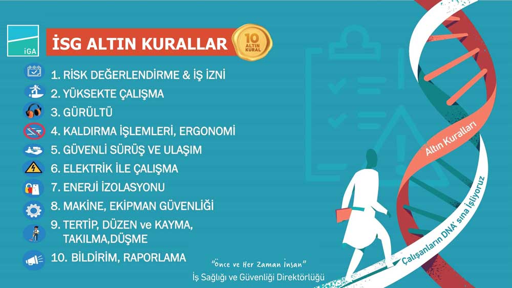 İGA İstanbul Havalimanı genel iş akışları, misafir hizmetleri, yapım ve onarım operasyonları, paydaş ve tedarikçi faaliyetleri ile tüm altişveren operasyonlarında güvenli ve sağlıklı çalışma kuralları belirlenmiştir. Herkes için geçerli olan İSG On Altın Kuralın eksiksiz uygulanması için eğitim, bilgilendirme ve denetim süreçleri gerçekleştirilmektedir.